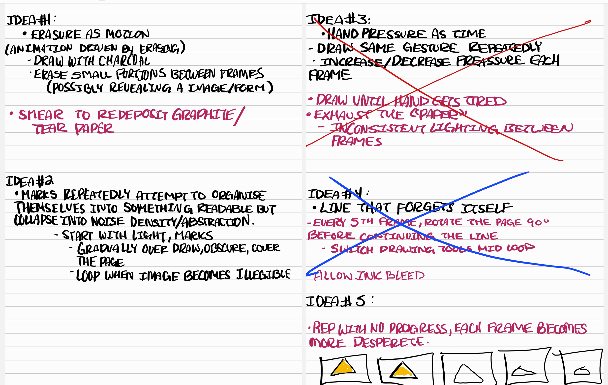 * Marks repeatedly attempting to organize thekmselves into something readable. * Collapses into noise Density & Abstraction. * Gradually over draw, obscure, and cover the page.